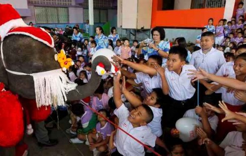 В Таиланде детей навестил самый толстый Санта Клаус в целом мире. Там его роль исполнил слон с белой бородкой и в красном колпаке. Слона-Санту сопровождали его верные эльфы, пока он гулял по улицам Бангкока.