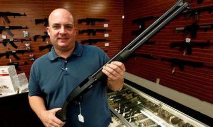 На фото: Shaun McClusky позирует в оружейном магазине с моделью дробовика для бесплатной раздачи согражданам