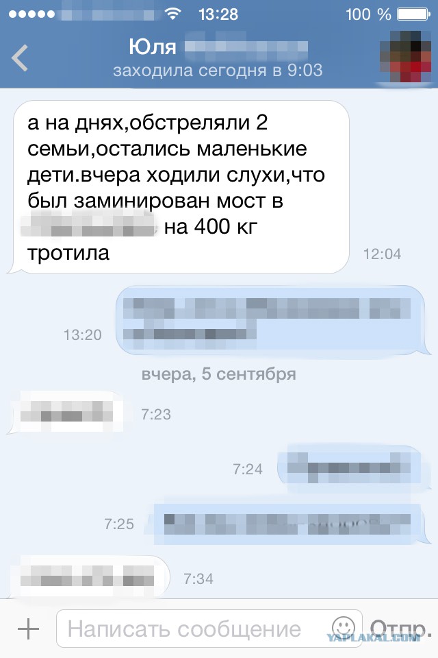 Скрин личной переписки с близкой подругой из той части Луганской области, где войск ополчения нет и близко!!! ..."(с)