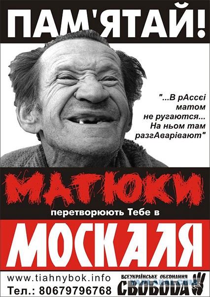 Это дело рук Свободы. Тягнибок один из трех вождей майдана. Сейчас его депутаты в правительстве. Тягнибок не один раз публично называл русских москалями. Его депутатша фарион приходила в детский садик во Львове и узнав, что ребена зовут на русский манер, рекомендовала ему вместе с родителями собирать чемоданы и уезжать в Московию. Его отморозки вместе с правым сектором на своих маршах призывают "москалей на ножи". Скажете, они маргиналы? Но за этих маргиналов в Киеве 20% проголосовало а на западе вообще под 50% и они там у власти на местах. А сейчас они у власти во всей Украине. Ну а так конечно.. "схид и захид" разом и.. "майдан бы не против русских"